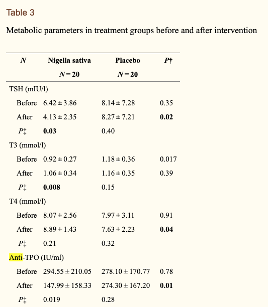 30. Farhangi MA, Dehghan P, Tajmiri S. Powdered black cumin seeds strongly improves serum lipids, atherogenic index of plasma and modulates anthropometric features in patients with Hashimoto’s thyroiditis. Lipids Health Dis. 2018;17(1):59. Published 2018 Mar 27. doi:10.1186/s12944-018-0704-x