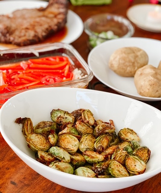 If you can find brussel sprouts in your local stores right now, this is a great side dish that works with any type of protein; beef, poultry, soy, or fish.